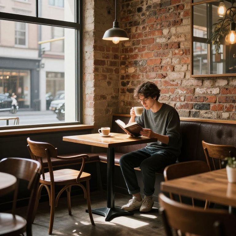 Adultos in a cozy modern cafe, soft natural light coming through large windows, relaxed ambiance, people engaged in deep conversations, intricate interior design featuring plants and books