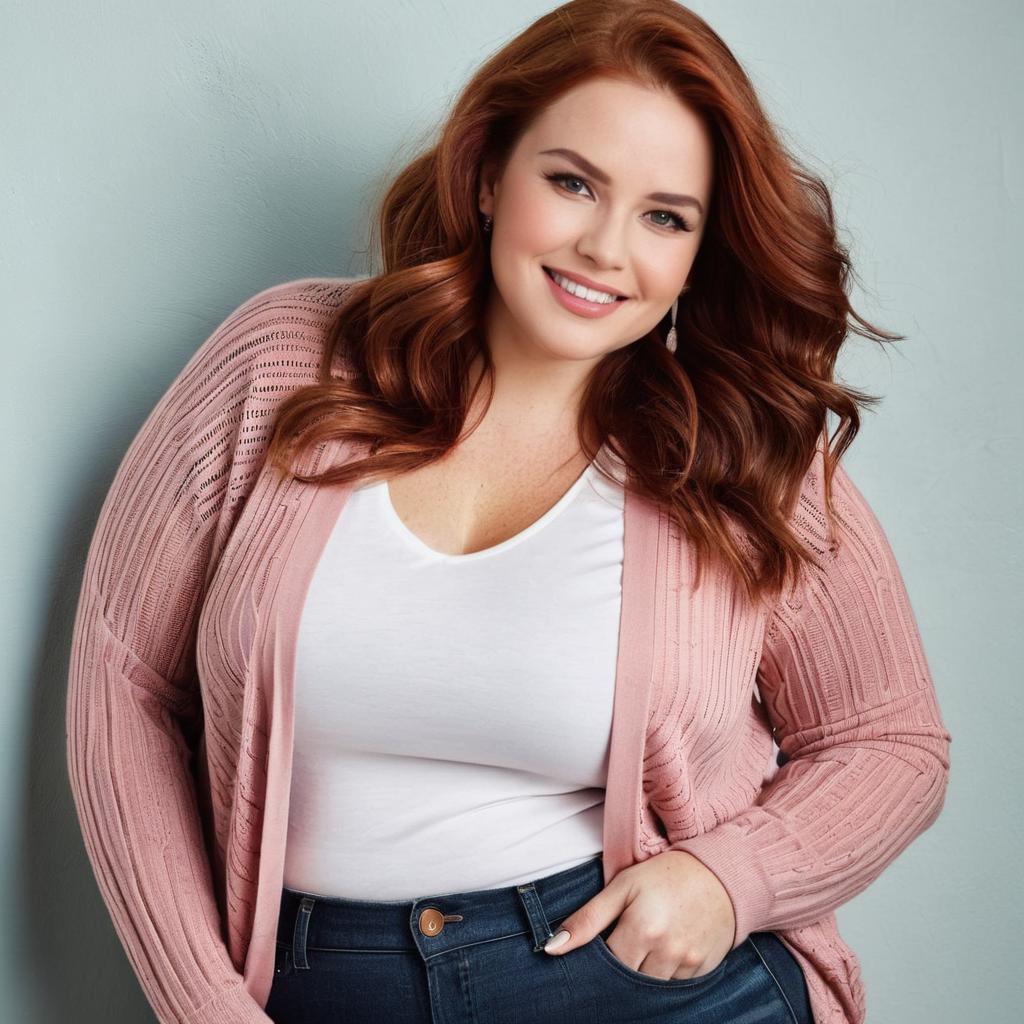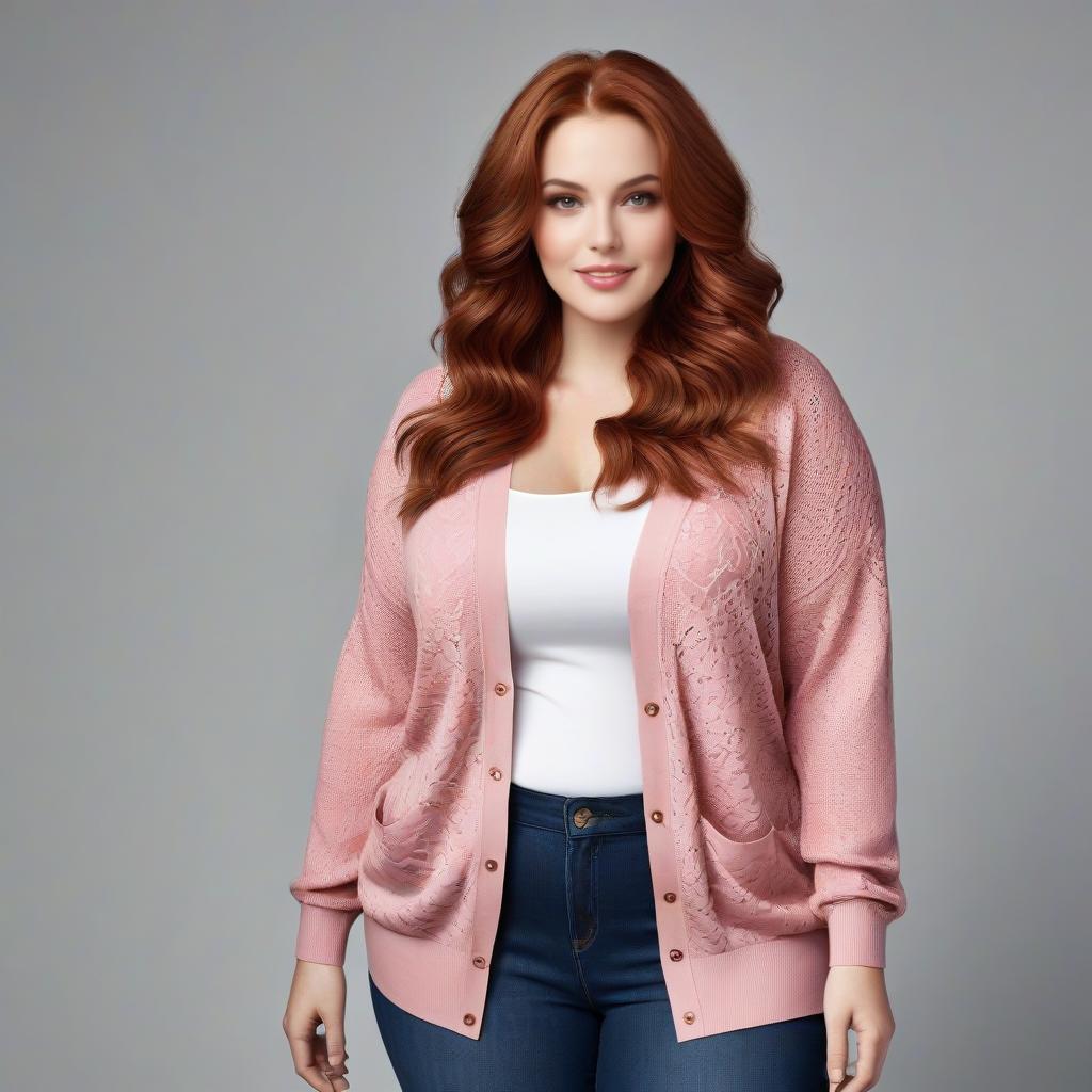 Woman with wavy auburn hair, wearing a pink cardigan, curvy, with soft curves