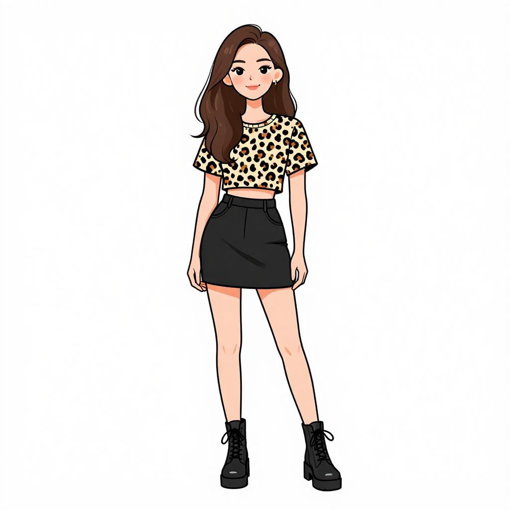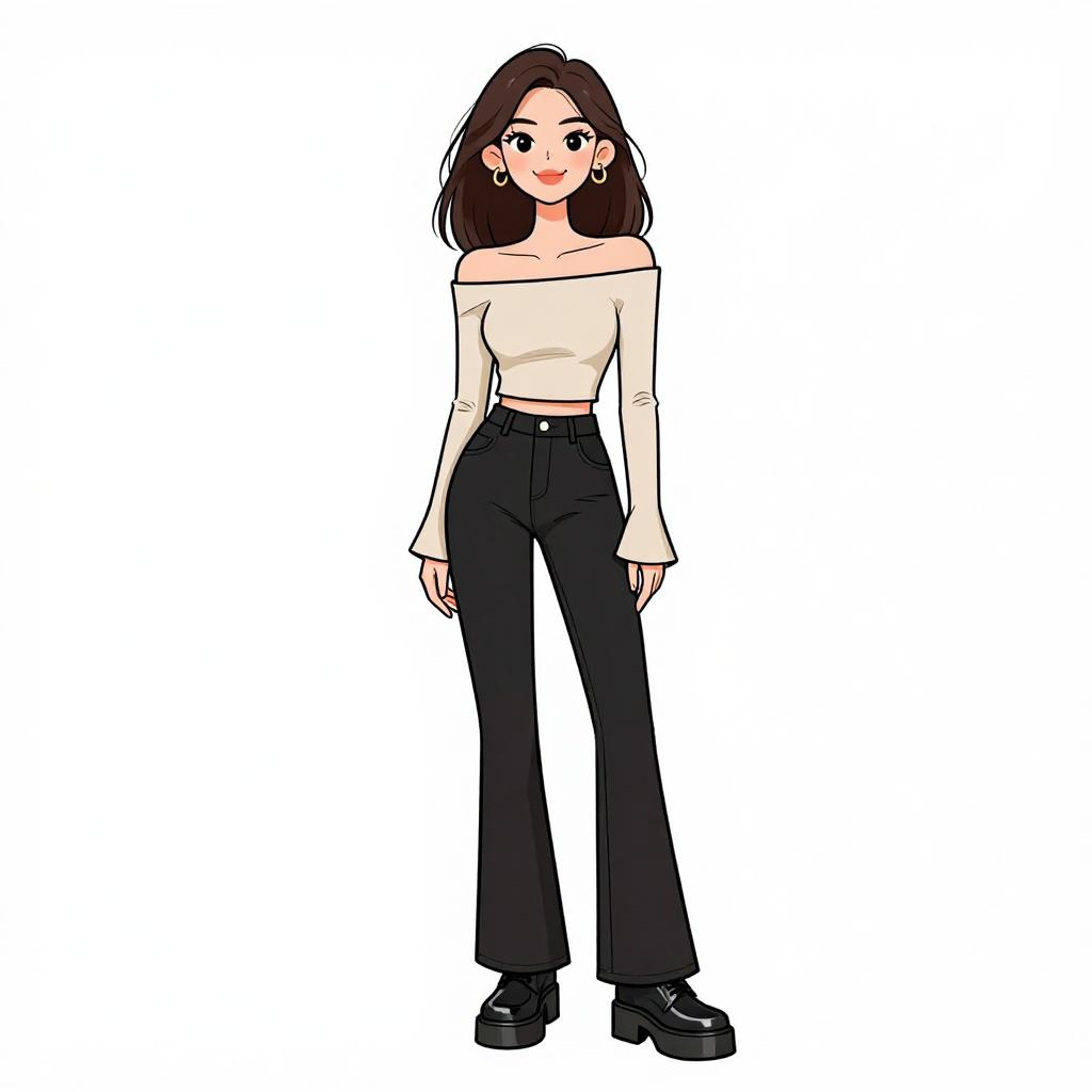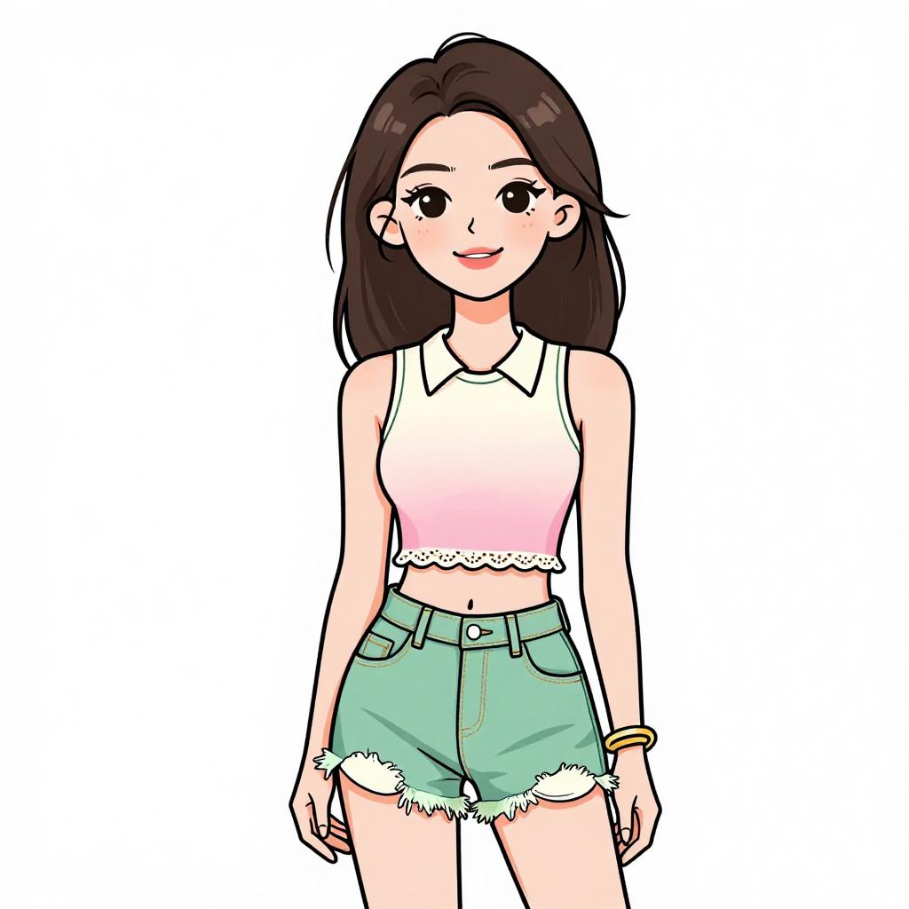 Woman with pretty face and pretty hair. smiling Woman, urban street style, cropped pink top with cut-out detail, short sleeves, high-waisted wide-leg denim jeans, faded wash, chunky white sneakers, gold chain bracelet, white studio background. --sref 1467