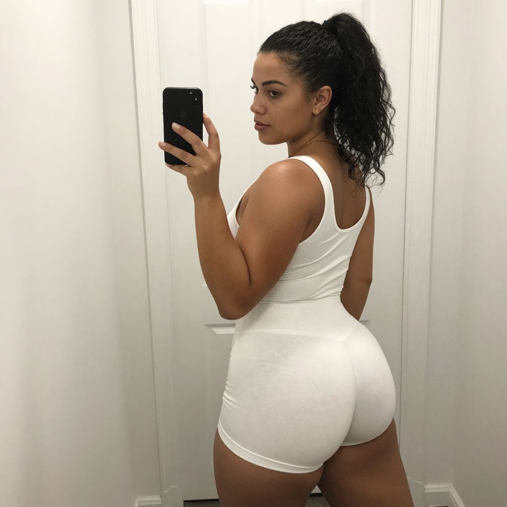 Photograph of a curvy woman with medium brown skin and curly black hair in a high ponytail, taking a mirror selfie in a white-walled room. She's wearing a tight white tank top and white high-waisted shorts that accentuate her ample hips and buttocks. She holds a black smartphone in her right hand, looking over her shoulder with a confident expression. The room has white doors and trim.