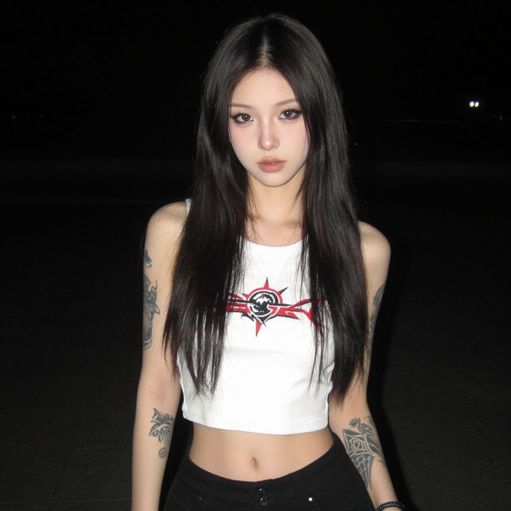 Photograph of a young woman with long, black hair and fair skin, standing against a dark background. She has prominent tattoos covering her arms and wears a white, cropped tank top with a red and black graphic on the chest. Her makeup is bold with dark eyeliner and nude lips. She's looking directly at the camera with a neutral expression. She's wearing black pants, and the image has a slightly overexposed, edgy look.