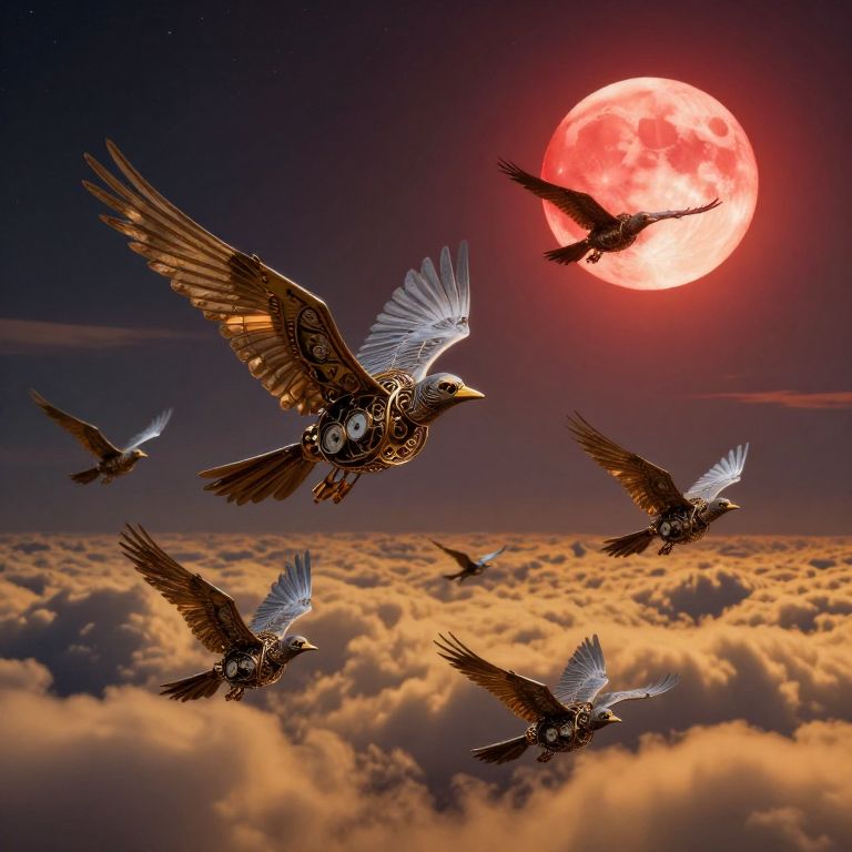 Clockwork Birds Under Blood-Red Moon