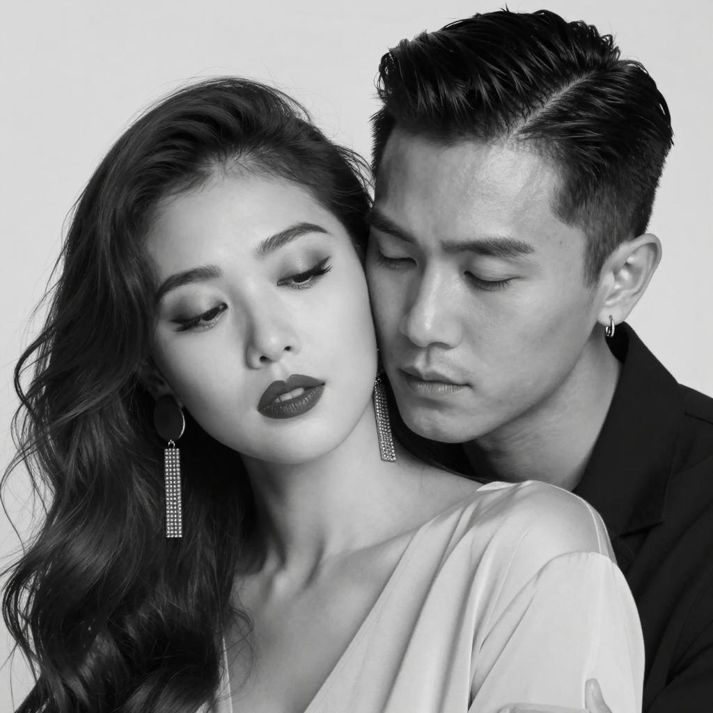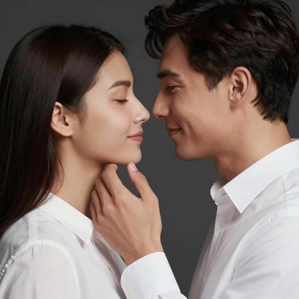 A man and woman facing each other, noses almost touching. Man has dark wavy hair, light skin, and a slight smile. Woman has straight dark hair, light skin, and closed eyes. Dark background. Man holds woman's chin with his right hand. Both wear white shirts. Man's right sleeve is visible. Intense, intimate facial expressions. Two people.