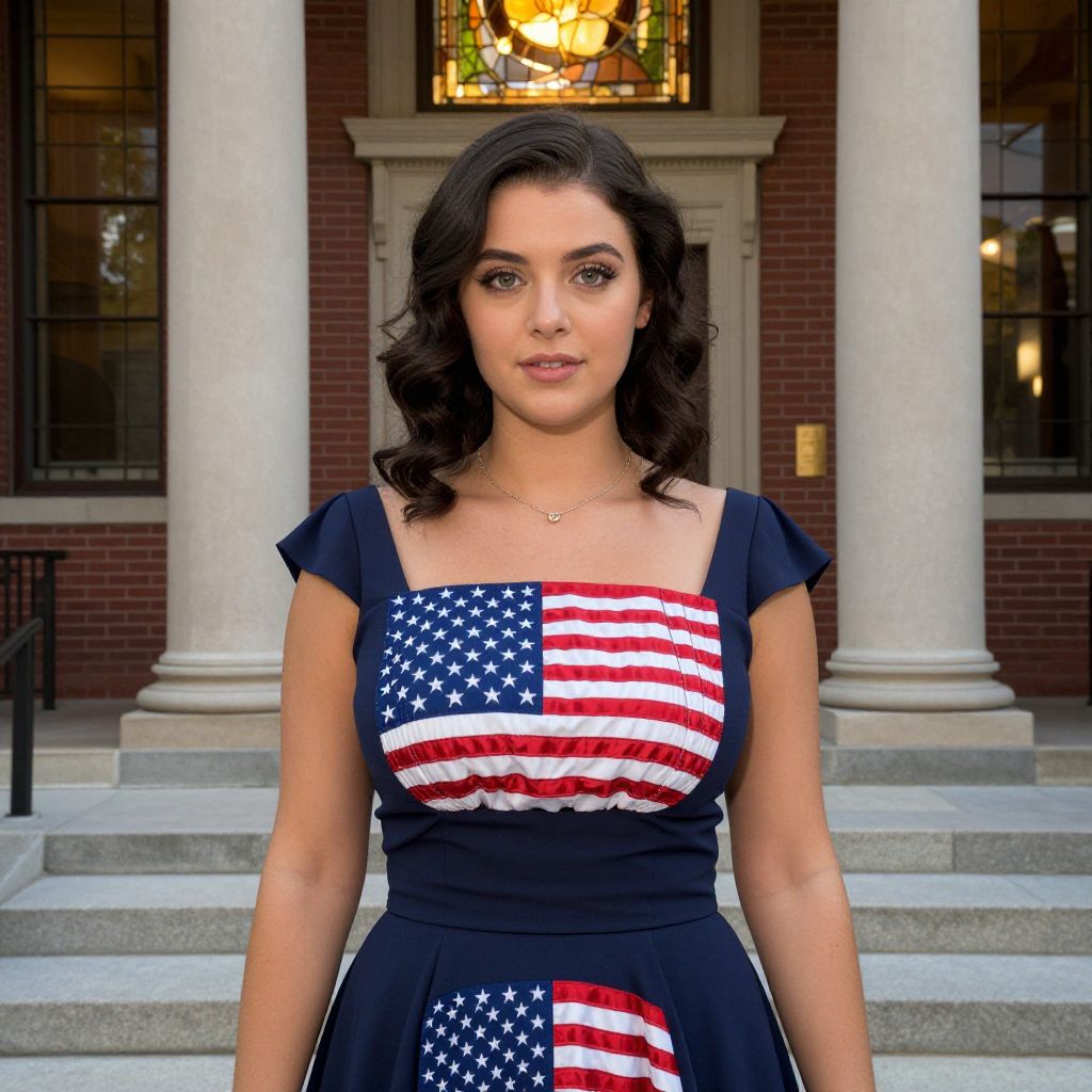 A young woman in her early 20s with expressive green eyes and wavy dark hair wearing a chic, elegant formal dress featuring a detailed American flag pattern in the center front and on the hem, standing in a traditional American courthouse with red bricks and tall columns, golden-hour sunlight filtering through a stained-glass window, realistic portrait style.. The woman has big tits and cute face