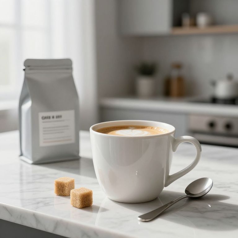 Close-up lifestyle shot of a freshly brewed coffee in a white ceramic mug with a creamer and sugar cubes on a marble countertop, modern minimalist kitchen background with soft morning light filtering through sheer curtains, a coffee bean bag in the background and a stylish coffee spoon beside the mug