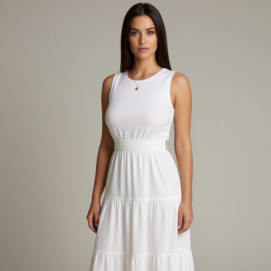 "Woman, casual chic, sleeveless midi dress in white, round neckline, gathered waist, tiered skirt, keyhole back fastening, simple pendant necklace, straight hair, plain studio background.. Sexy. Pretty face and beаutiful eyes. Big breasts."