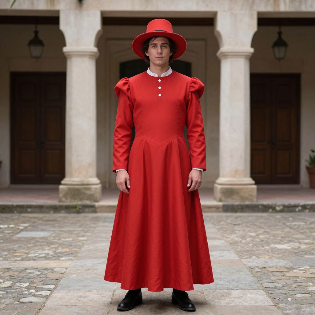 Man Pilgrim Costume, man in a red dress and hat standing in a courtyard