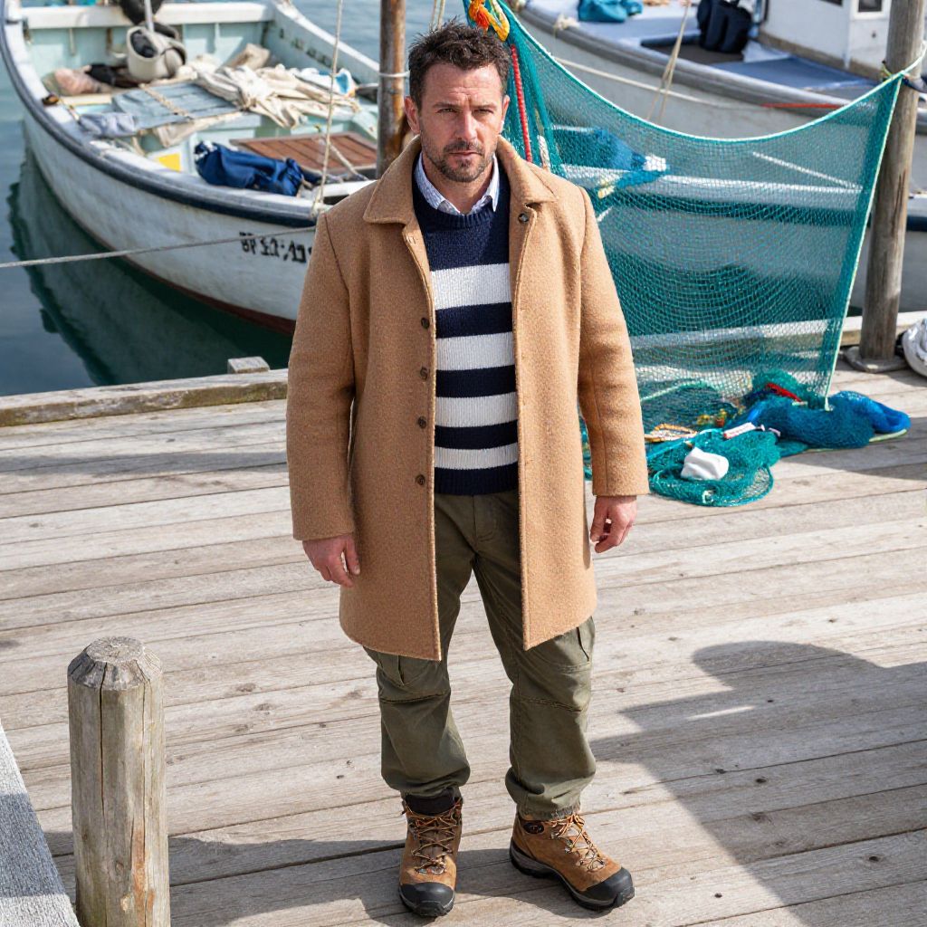 A man, wearing a camel wool peacoat, navy and white striped sweater, olive cargo pants, rugged brown hiking boots, standing on rustic wooden docks, weathered fishing boats in the background, vibrant nets drying in the sun, overhead shot, relaxed expression, enjoying the moment. Man has masculine face and piercing eyes