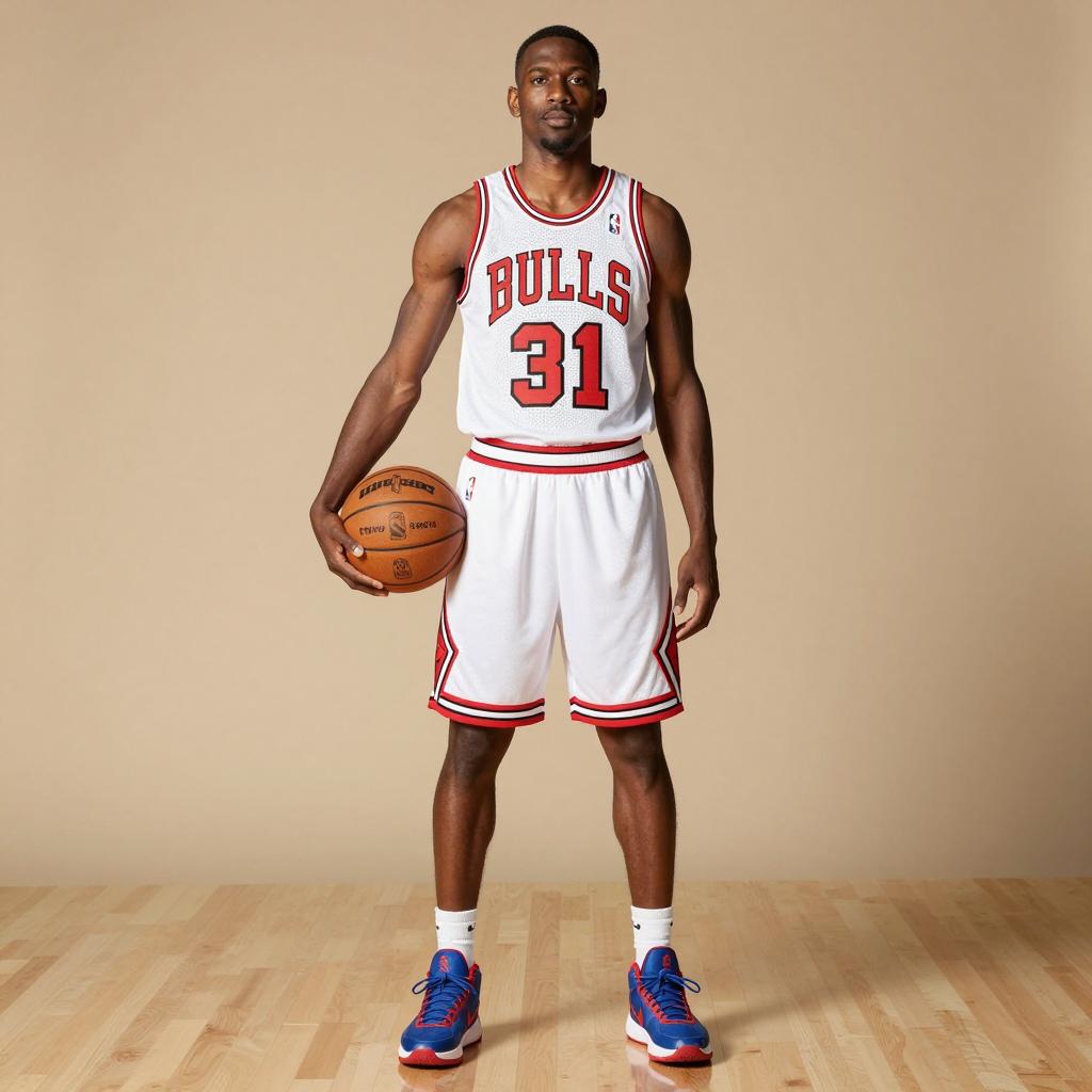 Nba shorts retro, photorealistic, full-body, standing, black male, muscular, wearing Chicago Bulls basketball uniform, number 31, holding basketball, wood floor, plain beige background, wooden ure, blue and red sneakers, short black hair, serious expression, studio lighting, professional basketball player, realistic ures, detailed, clear focus
