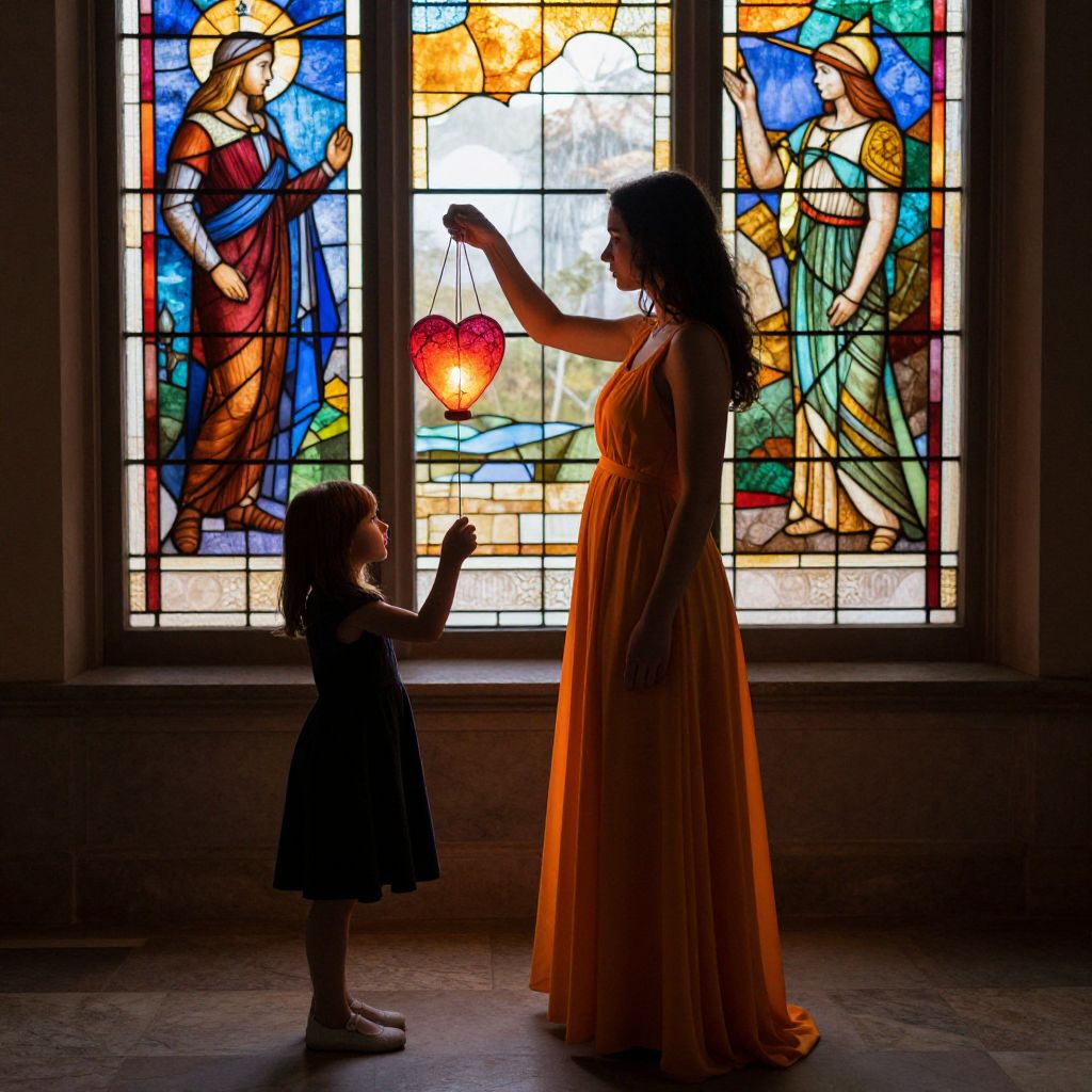 Silhouetted figures stand before a vibrant stained-glass window, as a woman in a flowing orange gown gently holds a glowing heart-shaped lantern aloft while a child in a dark dress reaches out to grasp its string, casting warm light across the stone floor.