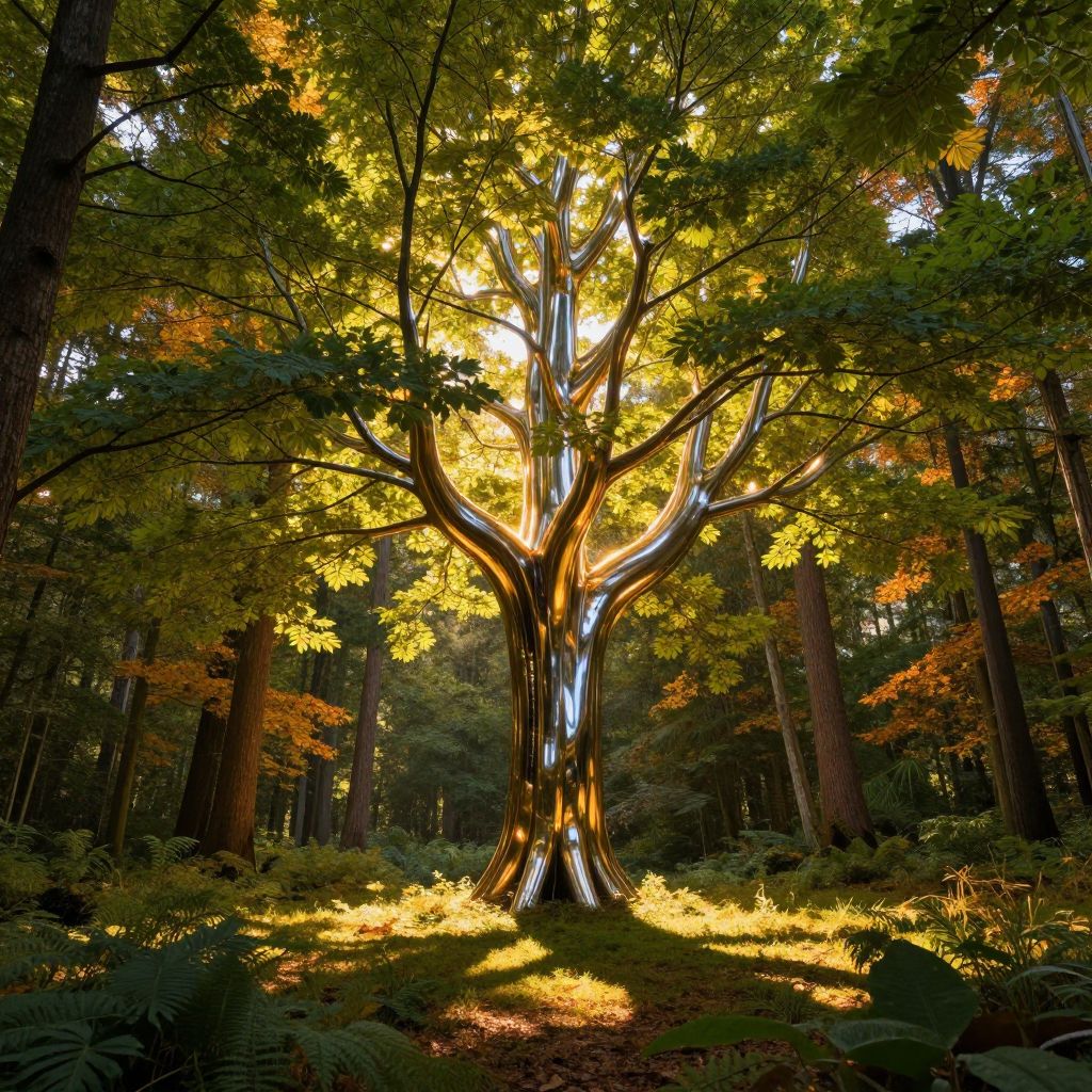 An awe-inspiring image depicts a surreal amalgamation of nature's splendor and technological marvels: an awe-inspiring tree with a metallic trunk emanating a warm radiance stands amidst the lush greenery of a vibrant forest glade. The tree's bark seamlessly transforms into polished steel, reflecting its surroundings as if it were a living mirror. From its branches, luminous leaves emit a gentle light, bathing the scene in an ambient glow that exudes serenity and amazement. The rest of the verdant forest is painted in rich autumn hues, with golden sunlight filtering through the canopy to create dappled shadows on the ground, accentuating the striking contrast between nature's organic elegance and the tree's metallic character. This extraordinary union of elements prompts viewers to ponder the delicate balance between technological advancement and our innate connection to the natural world.