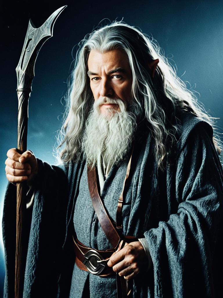 Man in Gandalf costume, waist-up studio portrait, cinematic lighting