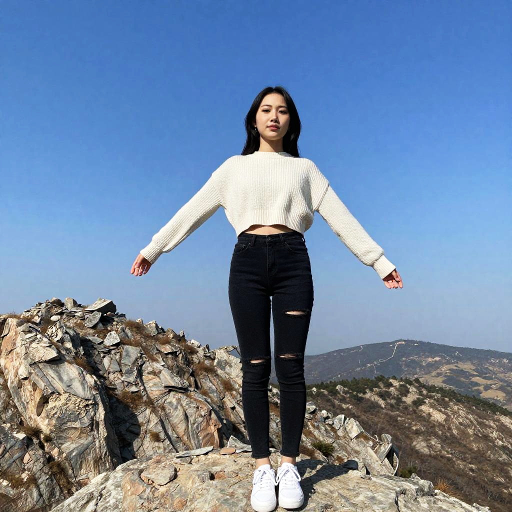 Photograph of a young woman standing confidently on a rocky mountain peak under a clear, bright blue sky. She has long, straight black hair, light skin, and an Asian ethnicity. She wears a white, long-sleeved, ribbed sweater and black, ripped skinny jeans with white sneakers. Her arms are outstretched, and she looks directly at the camera with a neutral expression. The rocky terrain beneath her is rugged and brown with patches of gray. In the background, there are rolling hills and distant mountains. The lighting is natural, highlighting her and the landscape vividly.