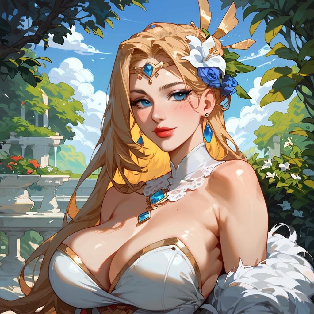 Digital artwork of a fantasy woman with long white hair, blue eyes, and intricate golden accessories including a crown-like headpiece, necklace, and earrings. She is dressed in a white fur-lined garment, posed against the backdrop of a dimly lit castle with ancient stone pillars and green foliage. The image conveys a mysterious and moody atmosphere.