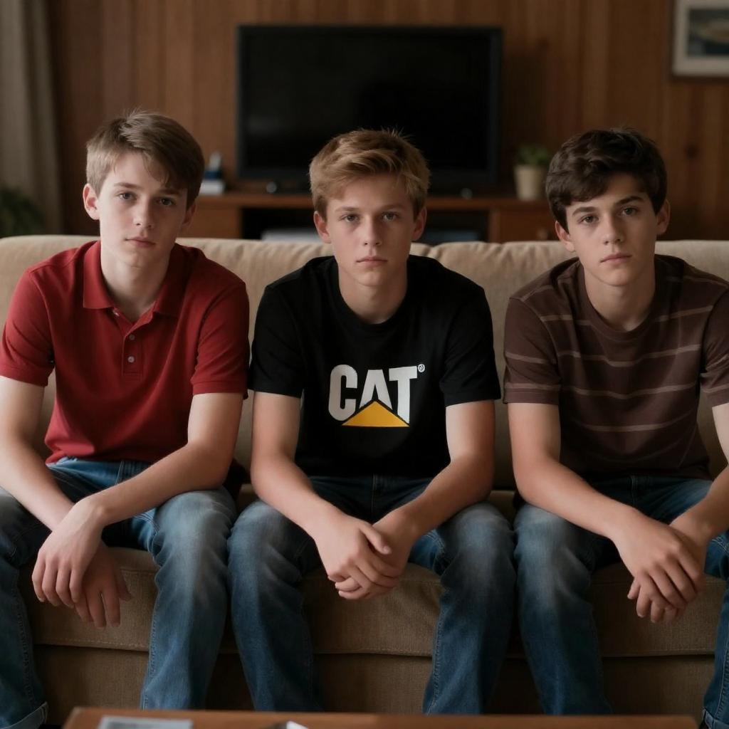 Three teenagers in red and yellow varsity jackets stand with arms crossed. Blonde girl in center, serious expression. Brown-haired girl to the left, neutral expression. Guy in background, brown beanie, neutral expression. Indoor setting, warm lighting. Background includes framed photos.