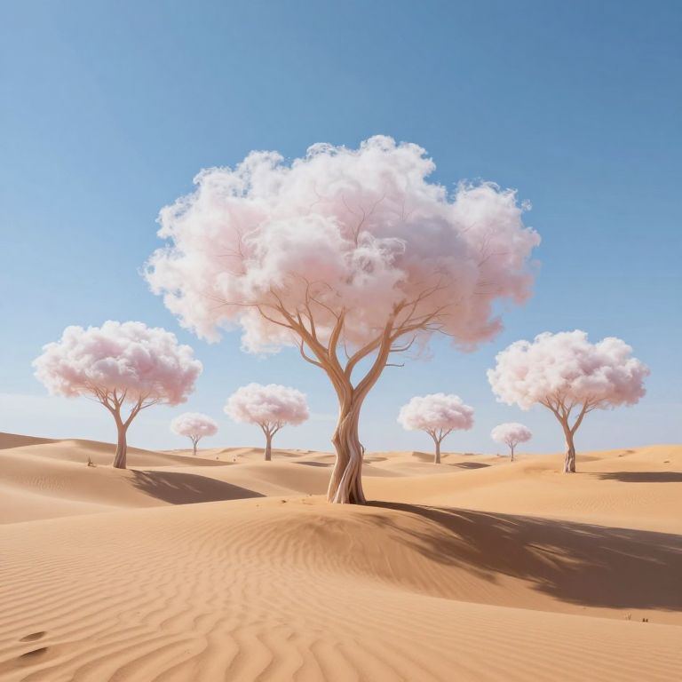 Surreal desert dunes transform into nine ethereal, cloud-like trees at midday, their soft, pastel forms casting delicate shadows across the undulating sand beneath a clear azure sky.