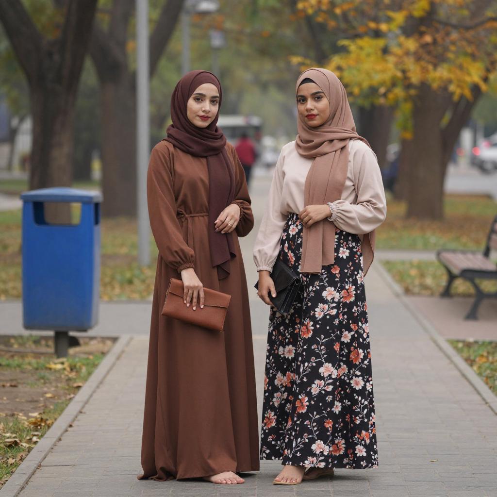 Photograph of two young women standing on a paved path in a park. Both wear brown hijabs and long brown dresses; one holds a brown clutch, the other a black one. The woman on the right has a black floral skirt and beige top. They stand barefoot, with a blue trash can and autumn trees in the background.