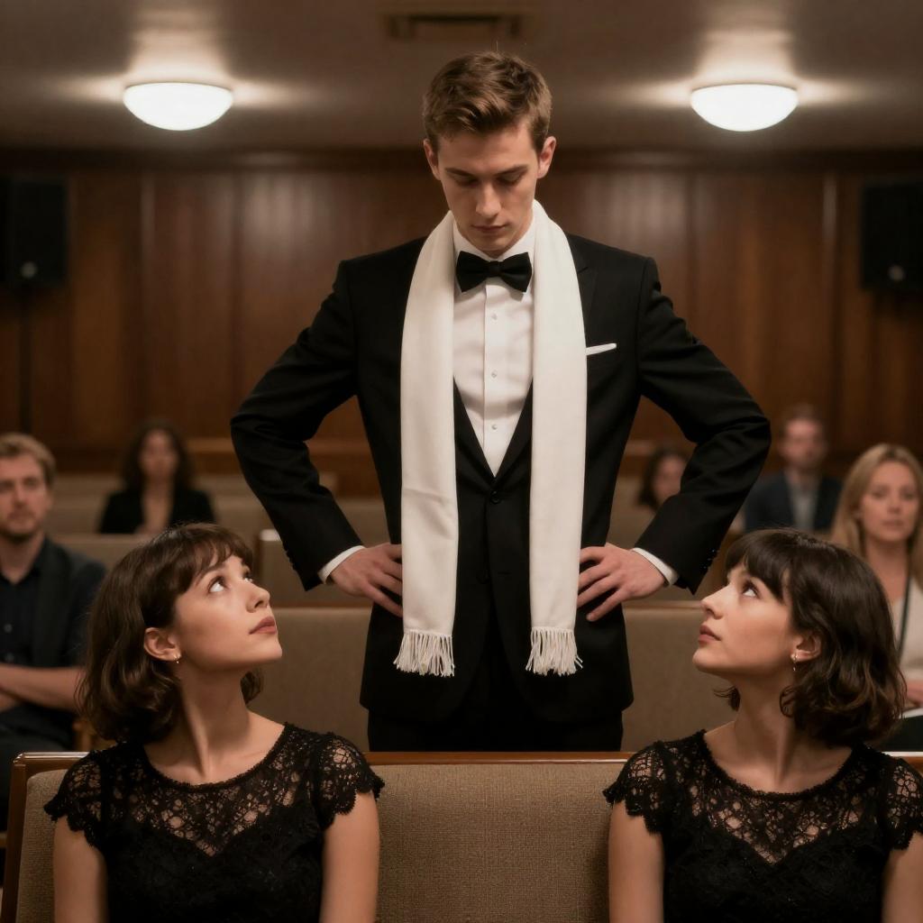 Young man in black suit with white scarf and bow tie stands in dimly lit room, hands on hips, looking down. Two women with short hair, black lace tops, sitting on couches, looking up at him. Background: people, wooden walls, ceiling lights.