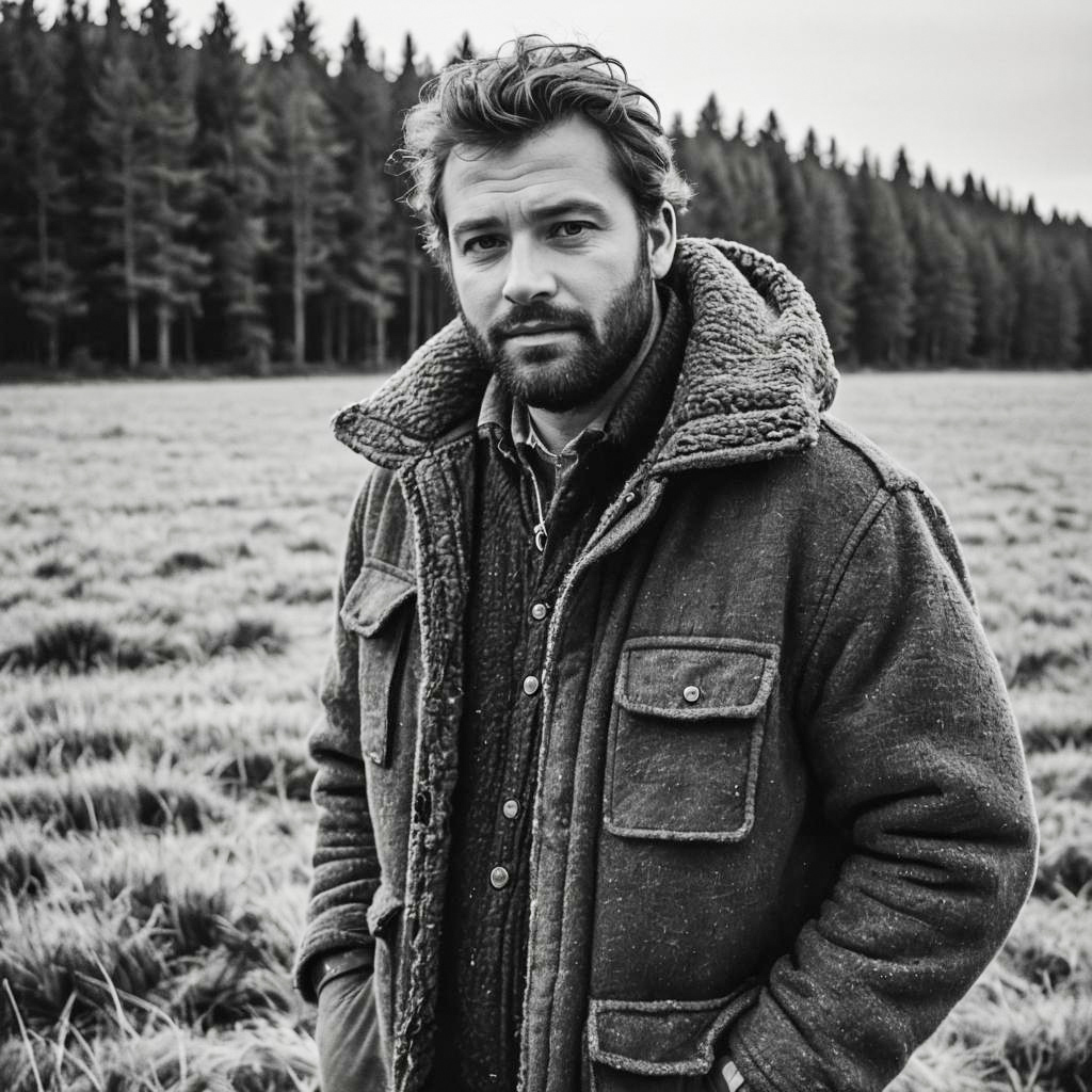 Photo of a Slim man, Bald, winter outfit, heavy canvas jacket and insulated shirt, classic fade color