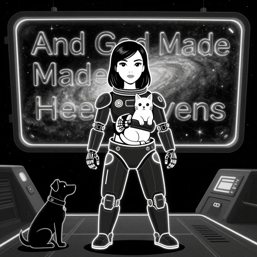 Black and white line drawing, pretty woman's head with shoulder length black hair, wearing a space force hat, on a dark colored cyborg body, she's facing the camera, face and eyes and neck are normal, hands properly formed with only 4 fingers and a thumb, she's standing on the bridge of a starship next to the large main view screen, neon lights outline her legs and arms and encircling her midriff, she's holding a cat in her arms, near her feet a dog is sitting on the floor, on the view screen is a picture of a spiral galaxy, overlaid on the view screen are letters, the letters have the appearance of dark frosted glass but with clear distinct borders, the letters say \"And God Made The Heavens\