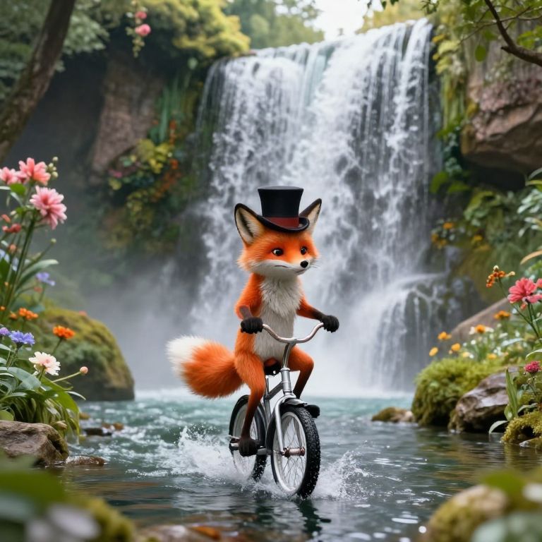 A whimsical fox adorned with a top hat gracefully balances on a unicycle, splashing through a serene stream flanked by enchanting waterfalls cascading from lush, flowering cliffs.