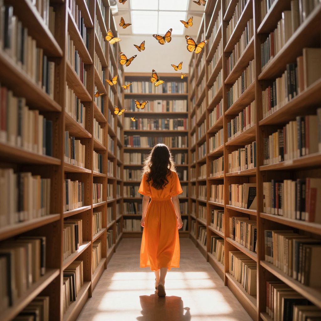 Photograph of a woman in an orange dress, walking down a sunlit library aisle with flying butterflies between tall bookshelves.
