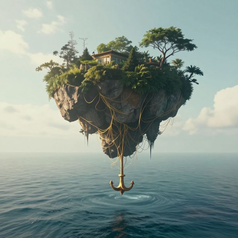 Suspended between sky and sea, the floating islands cradle a serene yet ephemeral world, their roots anchored by threads of gold that weave stories of transience and connection, while the gentle hum of life beneath the surface whispers of hidden depths and untold mysteries.