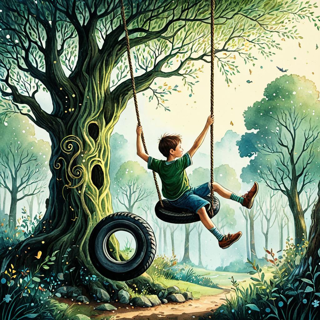 Create a book cover for a children's book called Journey Through the Magical Forest. The illustration features an enchanted willow tree with branches representing mythical creatures like unicorns, elves, and sprites. A young boy swings on a tire swing from the tree, symbolizing magical and imaginative human-to-nature connections. Rendered in a fantasy watercolor style with soft, mystical hues with splashes of gold. The title should be prominently displayed in elegant, whimsical font.