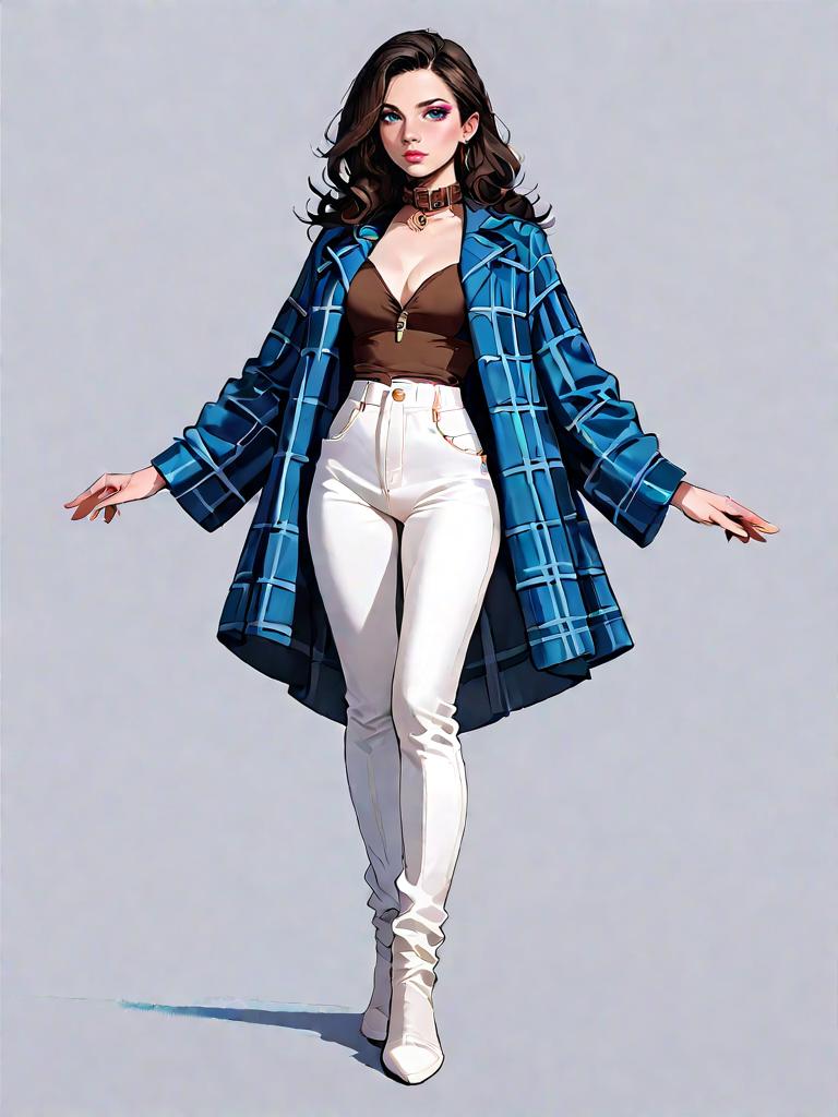 1girl, source_comics, realistic face, full body shot, Woman, casual, plaid button-up shirt in navy, white, and orange, rolled-up sleeves, lightly distressed skinny jeans, brown leather open-toe platform sandals.