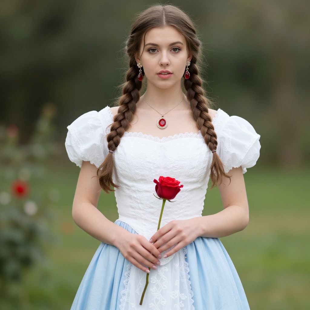 Photograph of a young woman with fair skin and long, brown hair in two braids. She wears a white, short-sleeved, puffed-sleeve blouse with a light blue, full-skirted dress. She holds a single red rose in front of her. She has a red gemstone necklace and dangling earrings. The background is a blurred green garden with a few red flowers. Her expression is neutral, and she stands centered in the image. The style suggests a fairytale or classic theme. The texture of her dress appears delicate and embroidered.