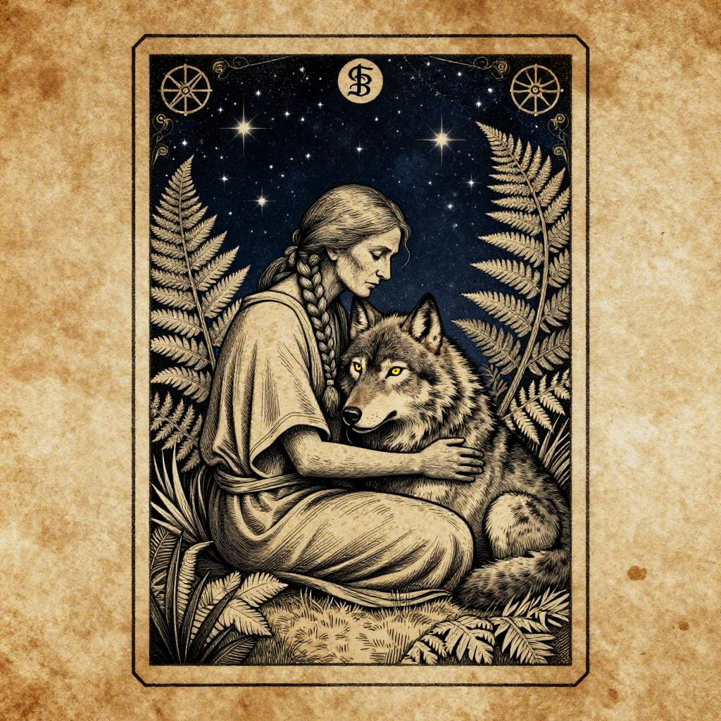 Detailed blackwork-style illustration of a stoic elder woman with braided hair seated among silver ferns, embracing a grey wolf with piercing yellow eyes. The background features a stark indigo night sky filled with shimmering stars, framed by an ornate tarot-style border with arcane sigils. The artwork is rendered with meticulous crosshatching, soft chiaroscuro, and subtle gold ink flecks on aged parchment texture, creating a mystical, hand-engraved look with an ultra-detailed linework and soft vignette.