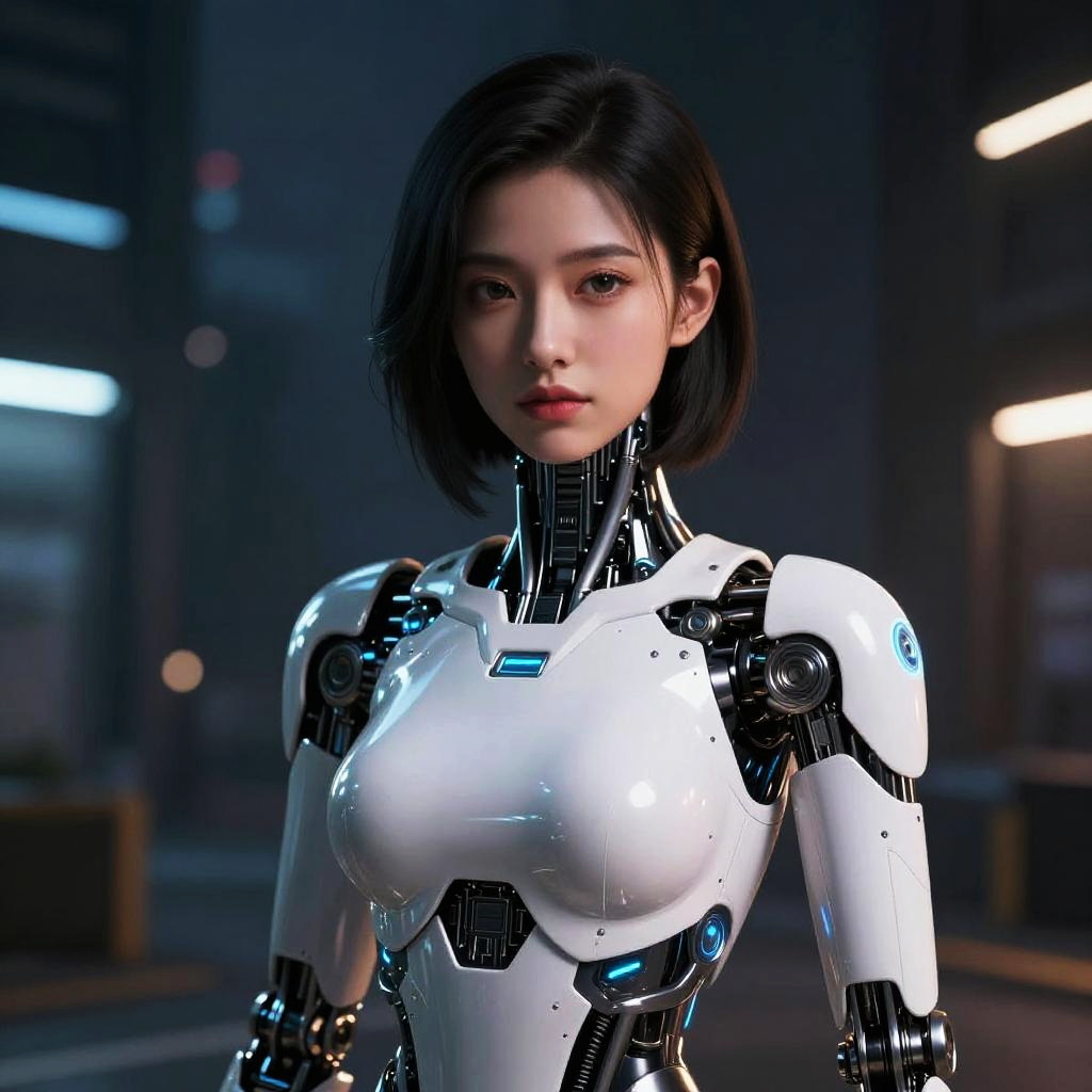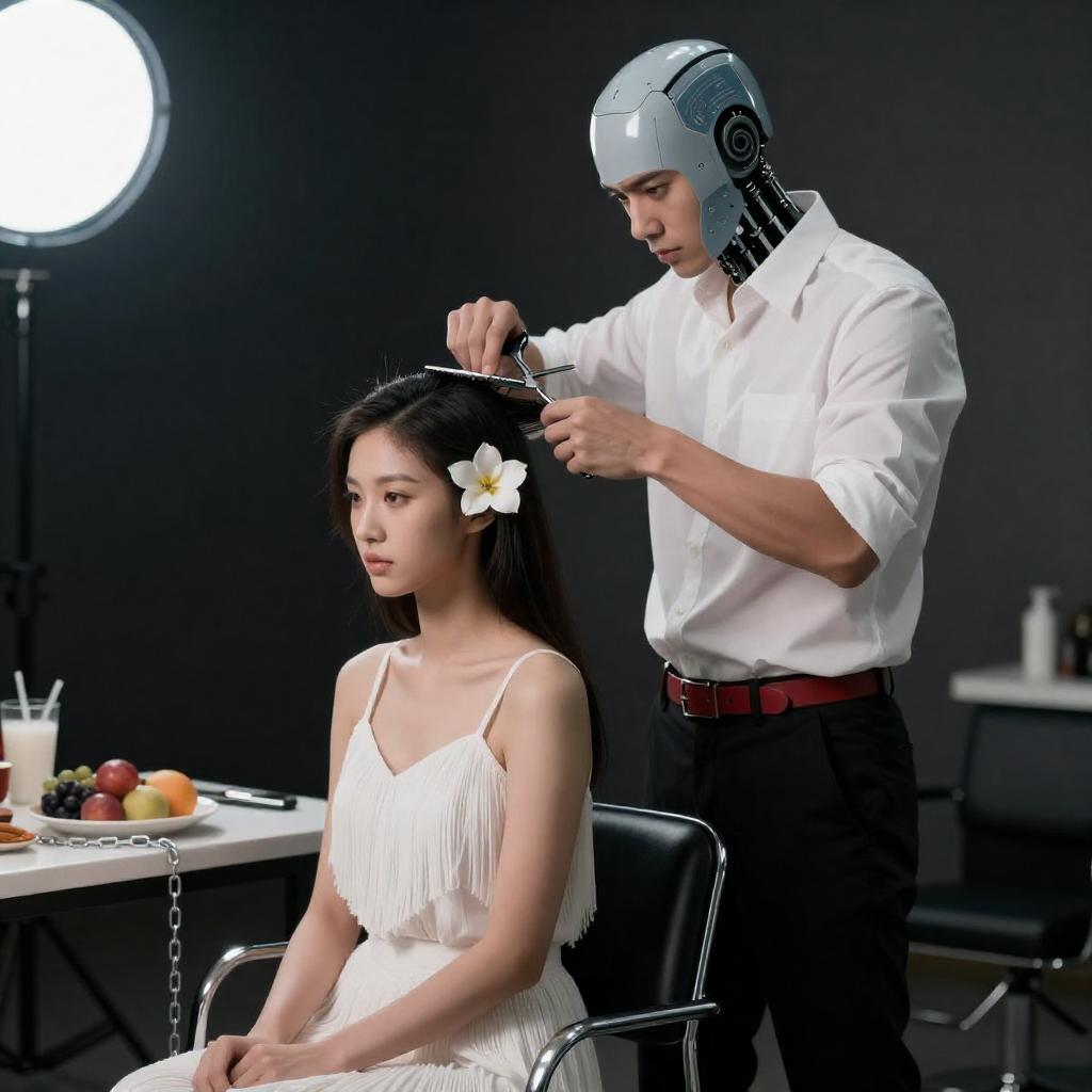 Photograph of a man with a cybernetic head cutting a woman's hair with scissors. Man wears white shirt, black pants, red belt. Woman wears white fringed dress, white flower in hair. Both seated at a table with food and chains. Woman's expression is focused, man's expression is intense. Dark background with circular light.