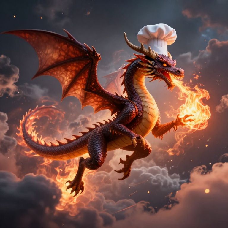 Digital art of a fiery red and black dragon mid-flight, wearing a white chef hat, with flames emerging from its mouth and tail, against a dramatic