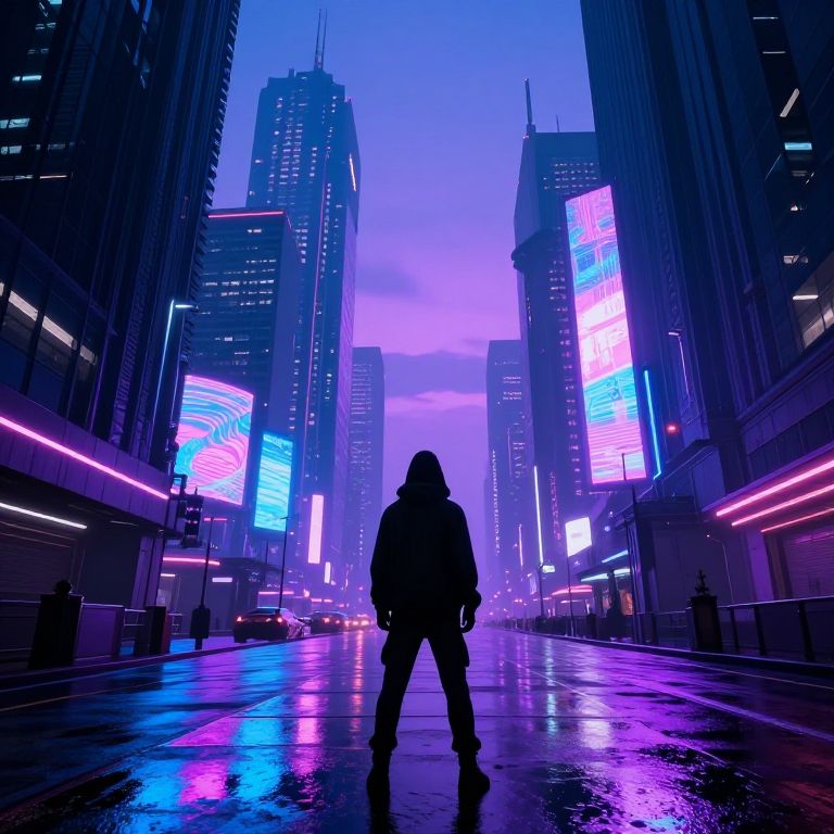 Silhouetted figure in hooded coat stands on neon-lit, rain-soaked city street, flanked by towering skyscrapers with vibrant