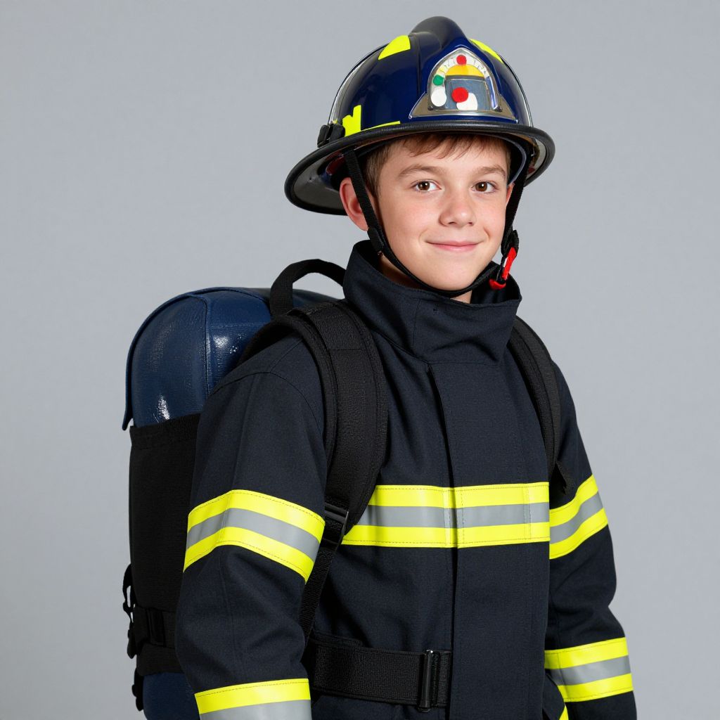 Photograph of a young Caucasian boy with fair skin, brown hair, and a slight smile, wearing a black firefighter's uniform with bright yellow and gray reflective stripes. He has a black firefighter helmet with a reflective stripe and a small red emblem on the front, and a black oxygen tank strapped to his back. The background is a plain, light gray. The boy's uniform is made of thick, durable fabric, and he stands facing the camera, exuding a sense of readiness and confidence.