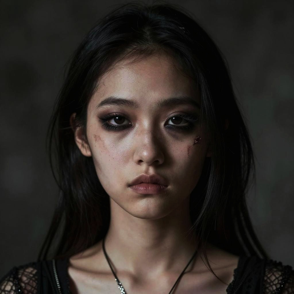 Masterpiece, best quality, photorealistic, head portrait, (a 21 year old skinny French Polynesian girl:1.2), medium hair over one eye, gothgirl, ruined makeup, sad look, intricate details, cinematic, dimmed colors