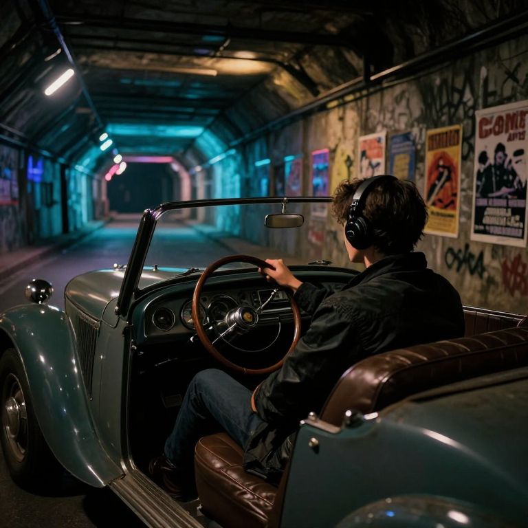 The image depicts a surreal, futuristic scene set in a dimly lit, underground tunnel. A person, wearing a dark jacket and headphones, is seated in the driver's seat of an old-fashioned car, which appears to be from the 1930s or 1940s. The car's interior is detailed with a retro dashboard, steering wheel, and seats, exuding a nostalgic, vintage vibe. The tunnel is adorned with vibrant, neon lights that create a stark contrast against the dark surroundings, adding a futuristic touch to the scene. The tunnel walls are covered in various posters and graffiti, contributing to the urban, gritty atmosphere. The overall composition is cinematic, with a strong emphasis on the interplay of light and shadow, enhancing the moody and surreal ambiance. The image is shot in high dynamic range, with realistic, analog colors that give it a photorealistic quality. The scene is reminiscent of a fantasy style, blending elements of the past with futuristic elements, creating a unique, immersive experience.