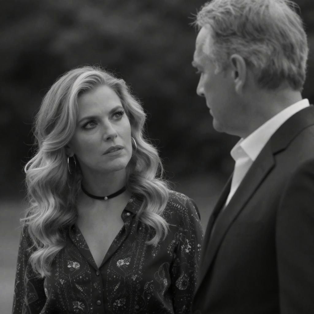 A black-and-white photograph depicts a woman with long, wavy blonde hair and hoop earrings, wearing a dark, patterned blouse and a choker necklace, looking intently at an older man with short, graying hair, dressed in a dark suit and white shirt. The woman's expression is serious and focused, while the man faces her, partially turned away. The background is blurred, suggesting an outdoor setting. The image has a dramatic, high-contrast style, emphasizing the emotional tension between the subjects.