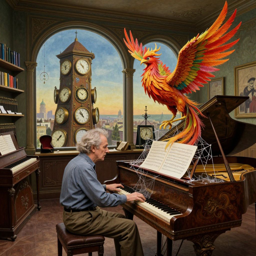 Elderly man playing piano as a vibrant, fiery phoenix hovers above sheet music in a clock-filled, sunlit study. Digital art.