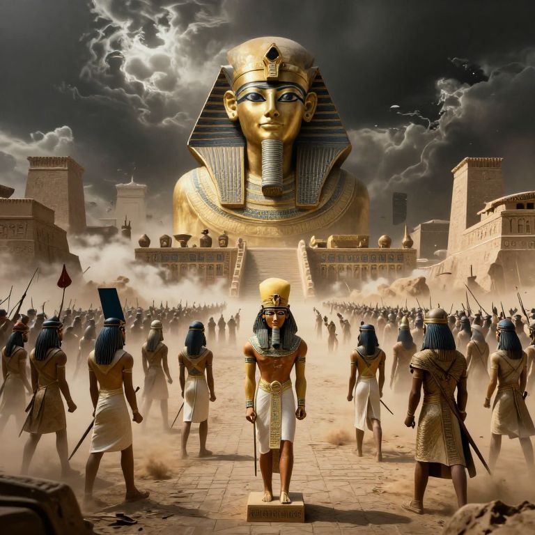 A hyper-realistic CGI image depicts an ancient Egyptian scene with a colossal golden statue of a pharaoh with a blue-striped nemes headdress, towering in the background under a dramatic, cloud-filled sky. In the foreground, a central figure in a golden headdress and white kilt leads a procession of soldiers with blue-striped headdresses, white kilts, and spears, marching through a dusty, stone-paved plaza. The soldiers are surrounded by towering, sandy-colored pyramids and temples, creating a grand, imposing atmosphere. The lighting is dramatic, with a bright flash of light illuminating the scene from above.
