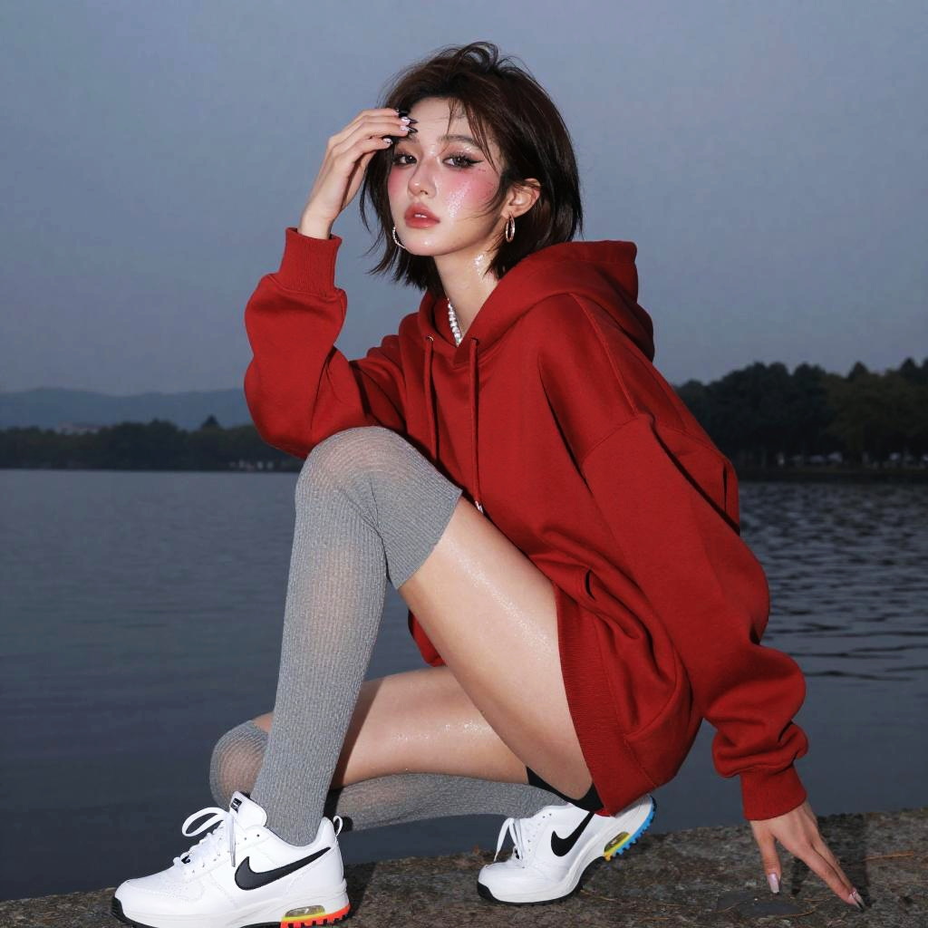 (8k, best quality, masterpiece, ultra highres:1.2), 1 girl, (red hoodie), (oversized_hoodie:1.1), hotsquat, beautiful 22 year old woman named Oki posing for full body photoshoot, grey thigh high socks, white nike kick shoes, colored tips, The Side Shave, dramatic eyeliner, satin lipstick, nail polish, semi-hoop earrings, pearl necklace, near lake, dusk, intricately detailed face and eyes, cute face, blush, glistening sweaty skin, dynamic pose, official art, extremely detailed CG unity 8k wallpaper, ultra high res, professional photography, sharp focus, HDR, 8K resolution, intricate detail, sophisticated detail, depth of field, analogue RAW DSLR, photorealistic