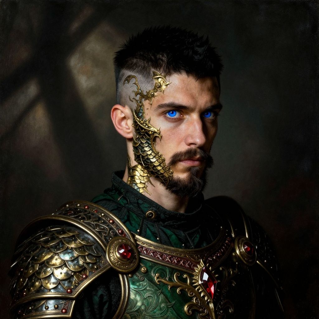 Emo haircut, undercuthaircut, Photorealistic oil painting of (Handsome:1.1) (Sicilian) (Italian) (Catalan) (French) (bright sapphire eyes) (half-dragon warrior-prince:1.2) with (intricate metallic brass scales seamlessly meldedn0.9), 28-year-old, (black undercut short hair:1.1), (medieval fantasy clothing:1.2), grimdark fantasy, (medieval) fantasy, high fantasy, epic fantasy, (upper body:1.3) (medium shot:1.3) taken with (fujifilm xt3:1.1), film grain, dark style, raking light dramatic hard shadows, (dramatic lighting:0.9), material contrast, cinematic composition, intricate details, masterpiece, visually stunning, evocative, vivid deep hues, brass, red Crystal, (body transformation:1.2), , realistic eyes, scaleborn, scales, undercut, royal, darkgreen armor, symmetrical armor, Milanese, Venice, Genoa, identical eyes, identical iris, identical pupils, large moustache, goatee