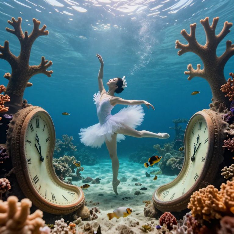 An underwater ballet unfolds from an insect-like perspective, where graceful marine creatures perform intricate choreography around submerged, distorted coral sculptures reminiscent of melting clocks. This dreamlike scene evokes awe with its harmonious blend of surreal aquatic beauty and Dali-esque distorted perspective, casting an ethereal glow on the dance of life beneath the waves.