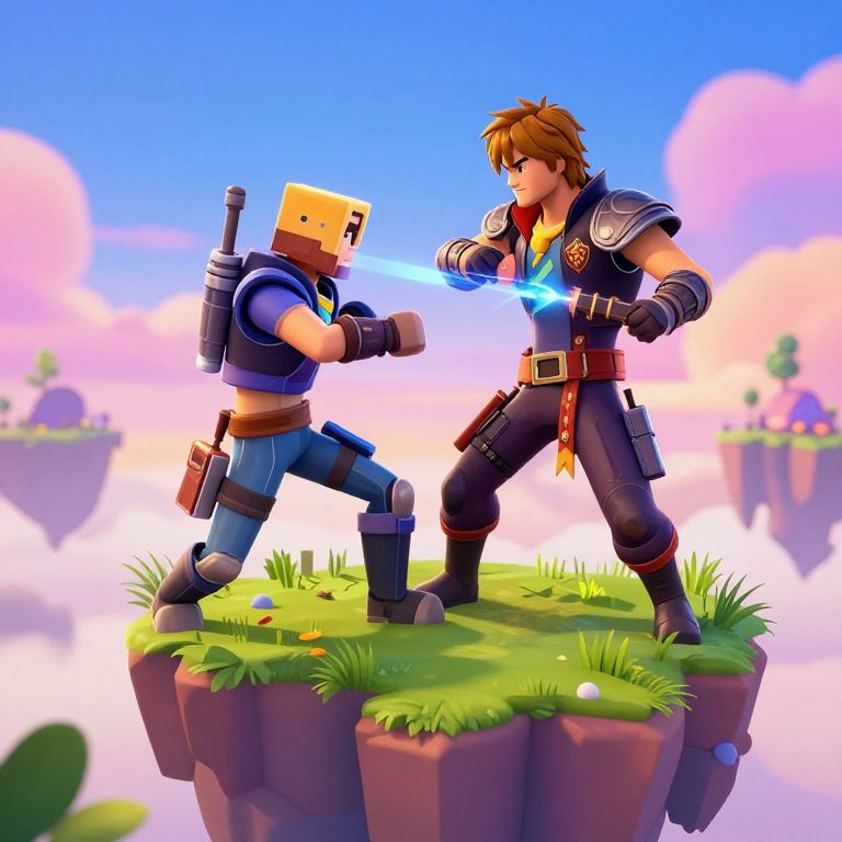 Digital artwork of a Cube-headed warrior with gun and a brown-haired, armored fighter exchanging blue energy blasts on a grassy cliff. Bright, colorful sky