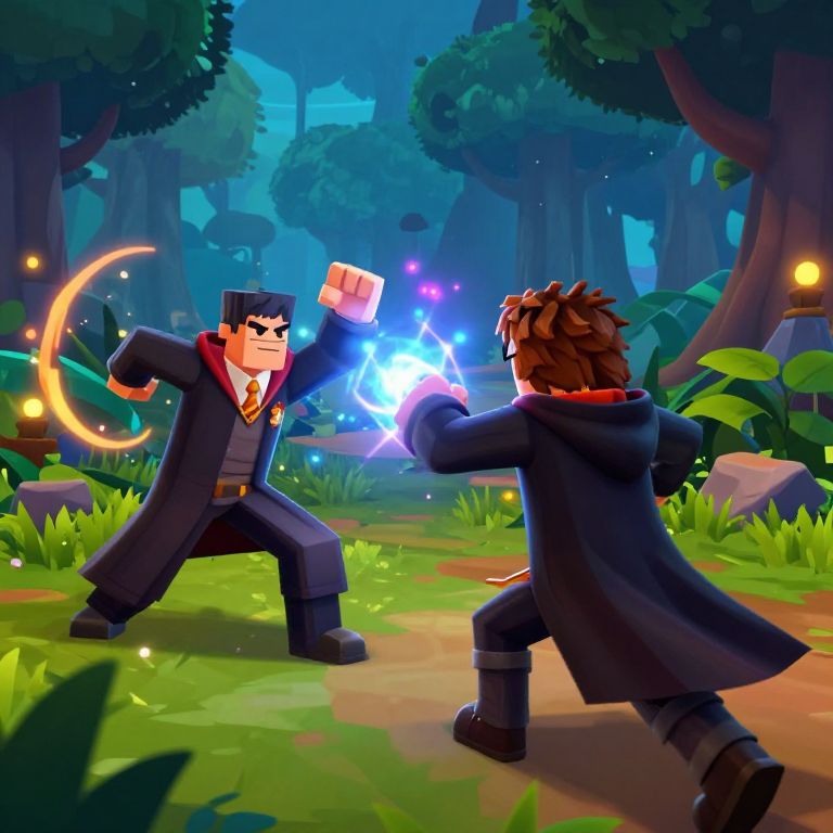 Harry Potter in Fortnite universe, with Fortnite-style armor and magical accessories, engaging in a duel on a floating island, colorful sky, high-energy fantasy scene
