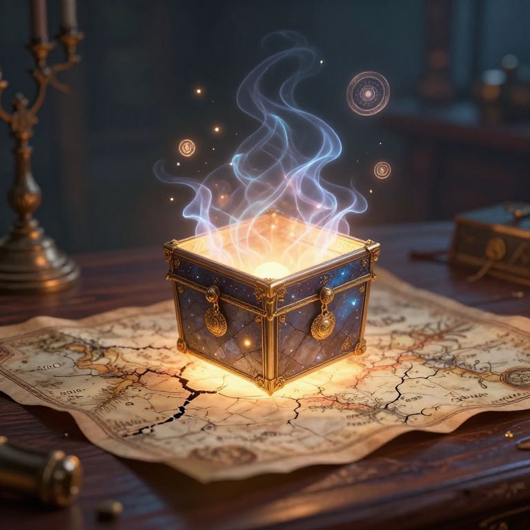 Pandora's box hovering above a cracked ancient map on a wooden table, emitting a soft mystical glow with ghostly wisps and arcane symbols floating around, rendered in a cinematic fantasy art style with warm and cool tones blending harmoniously.
