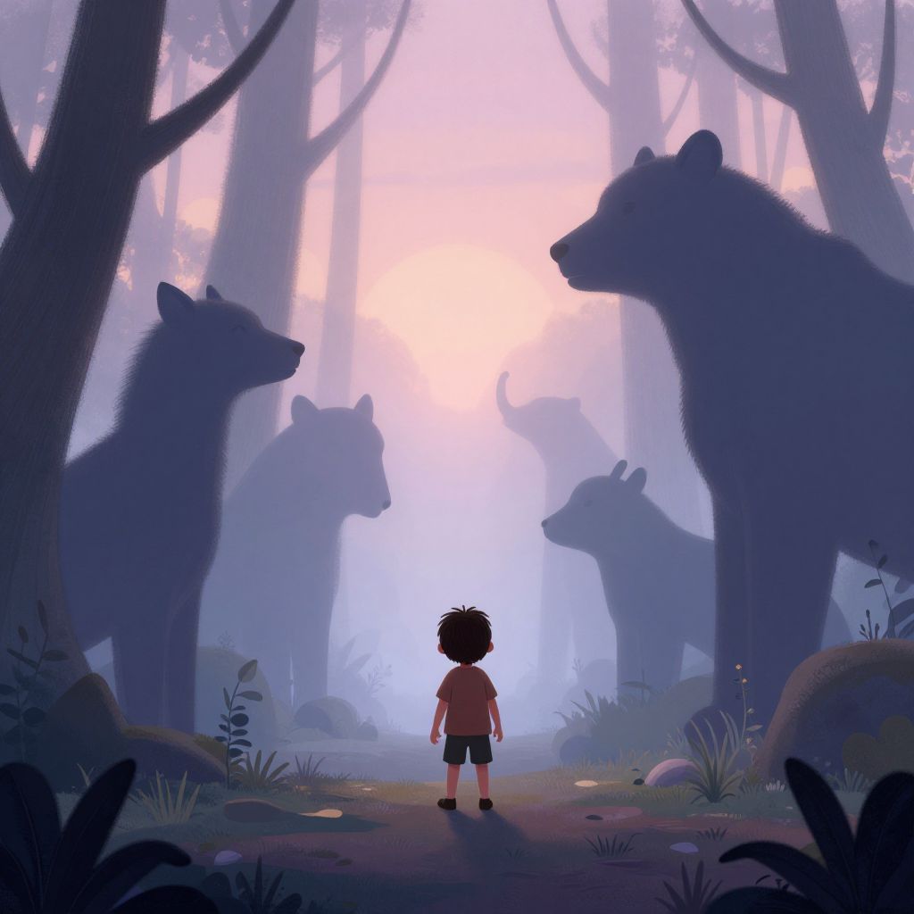 A symbolic representation of the phobia of big things, showing a frightened child facing enormous animal silhouettes in a foggy, mystical forest at twilight, using soft lighting and pastel tones to contrast fear with beauty, detailed digital painting style.