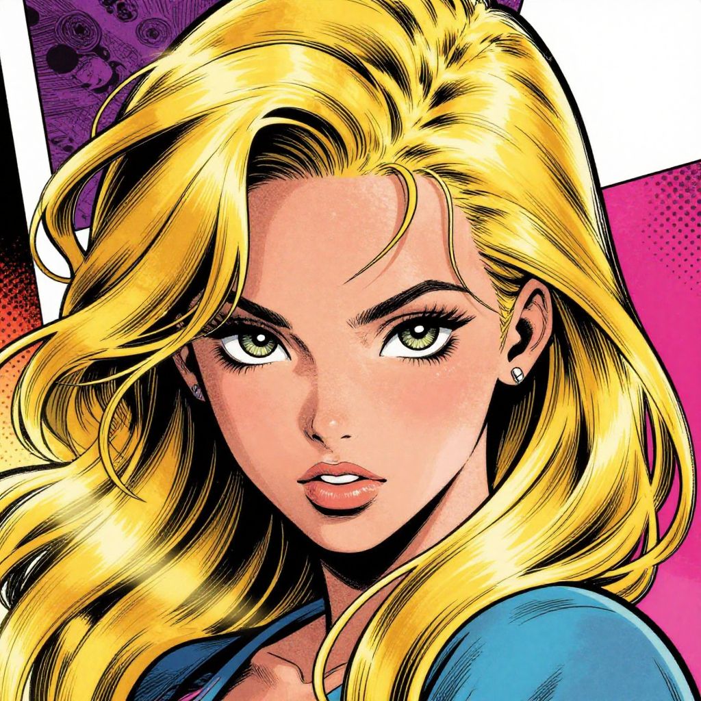 This vibrant illustration features a young woman with striking features and flowing blonde hair, styled in a dynamic comic book fashion. The artwork employs bold colors and sharp lines, characteristic of contemporary graphic novels, creating an engaging and energetic composition.