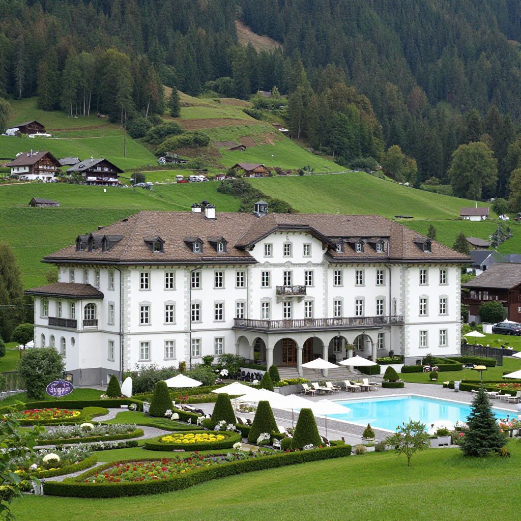 Gstaad Palace, nestled amidst lush green hills and dense pine forests in Gstaad, Switzerland, showcases its elegant architecture with a sprawling white building featuring a brown roof, surrounded by meticulously manicured gardens, a serene pool, and outdoor seating areas under white umbrellas.