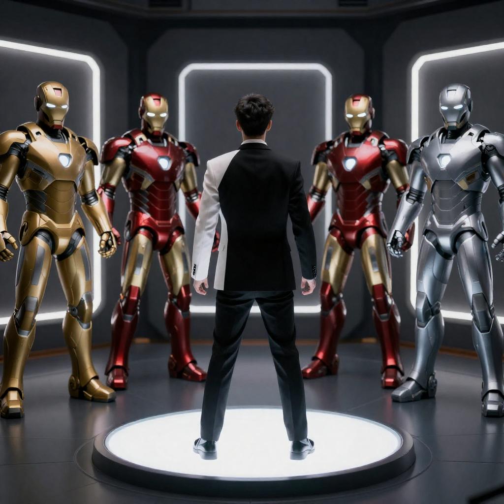 Man in black and white suit, back facing camera, stands on glowing circular platform. Surrounds six Iron Man suits, varying metallic colors: gold, red, silver. Dark, futuristic room with lit rectangular bays. Man's arms raised slightly, tense. Suits in upright, symmetrical positions.